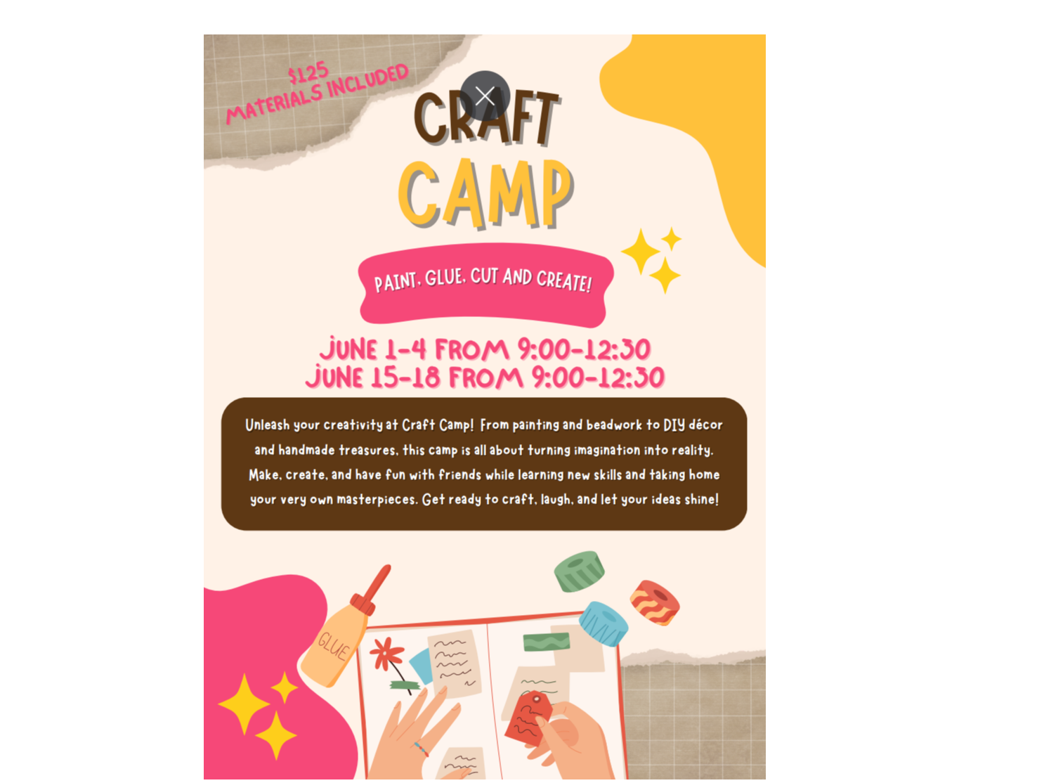 Unleash your creativity at Craft Camp! From painting and beadwork to DIY decor and handmade treasures, this camp is all about turning imagination into reality. Make, create, and have fun with friends while learning new skills and taking home your very own masterpieces. Get ready to craft, laugh, and let your ideas shine.