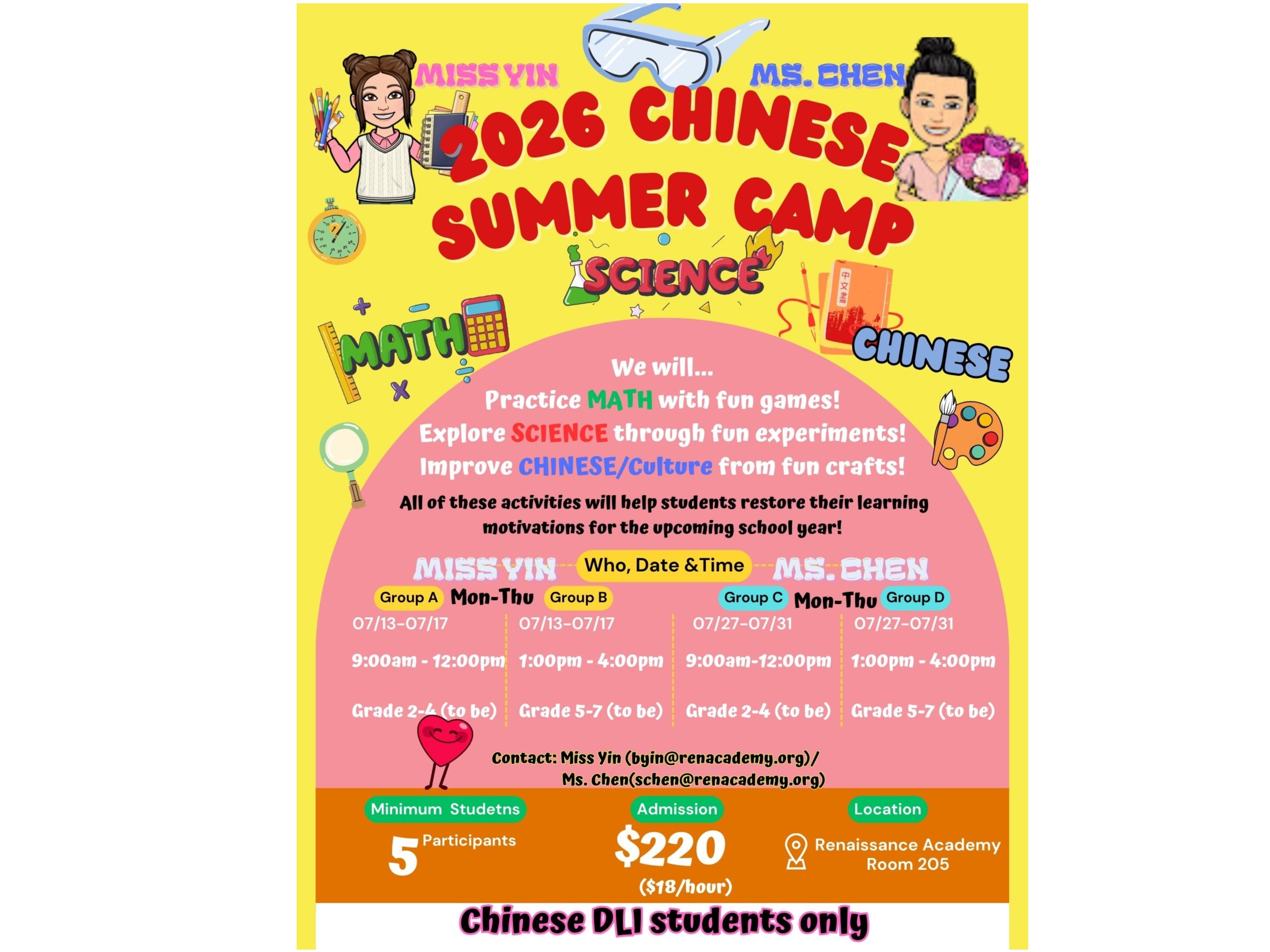 Chinese Camp will include Chinese language learning, math games, simple science experiments, and Chinese cultural activities.