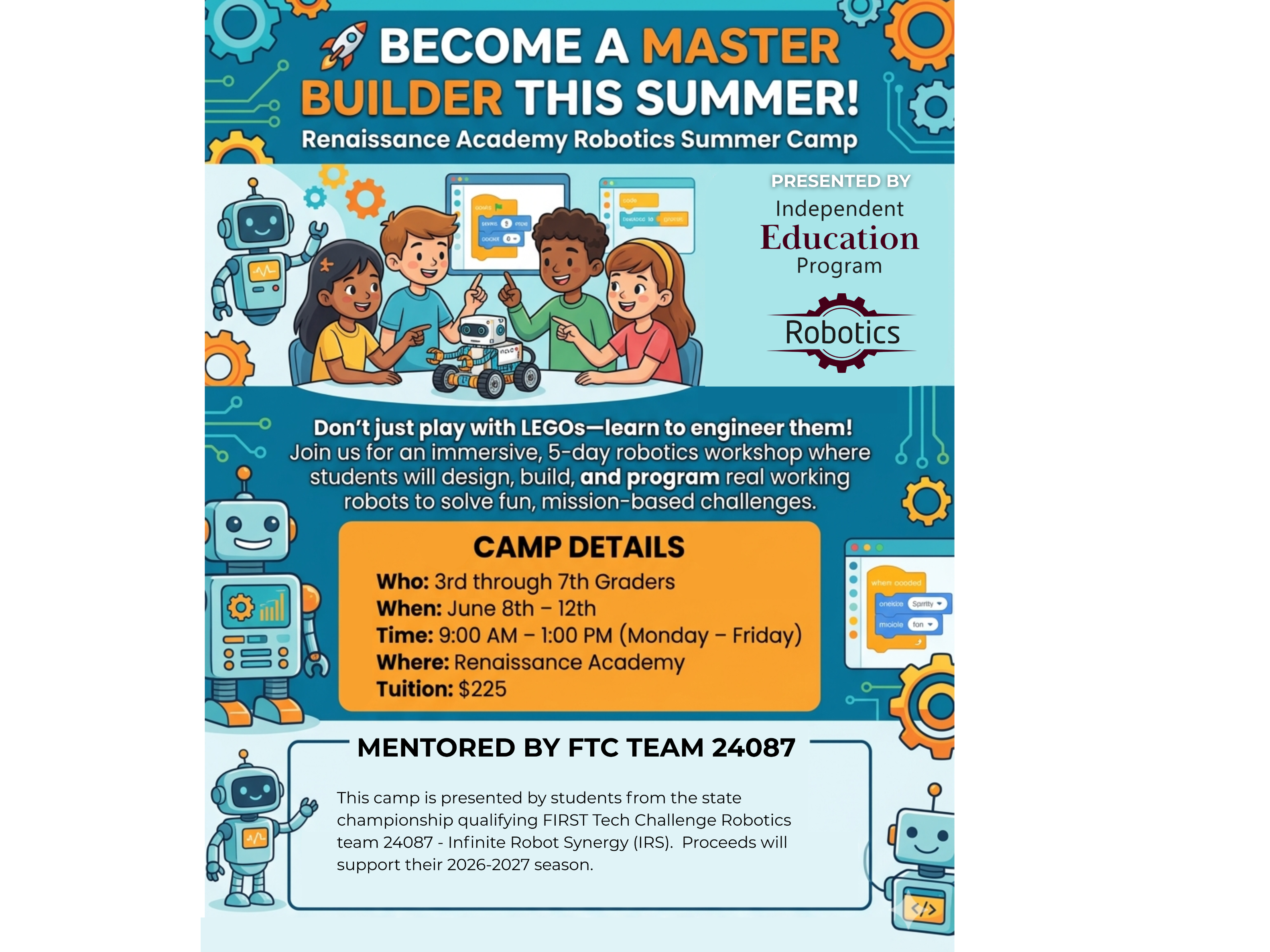 A hands-on, week-long workshop where students (Grades 3-5) use the FIRST LEGO League framework to design, build, and program robots. The camp will be led by adult coaches and mentored by members of the state-qualifying FTC Team #24087 "Infinite Robot Synergy."
