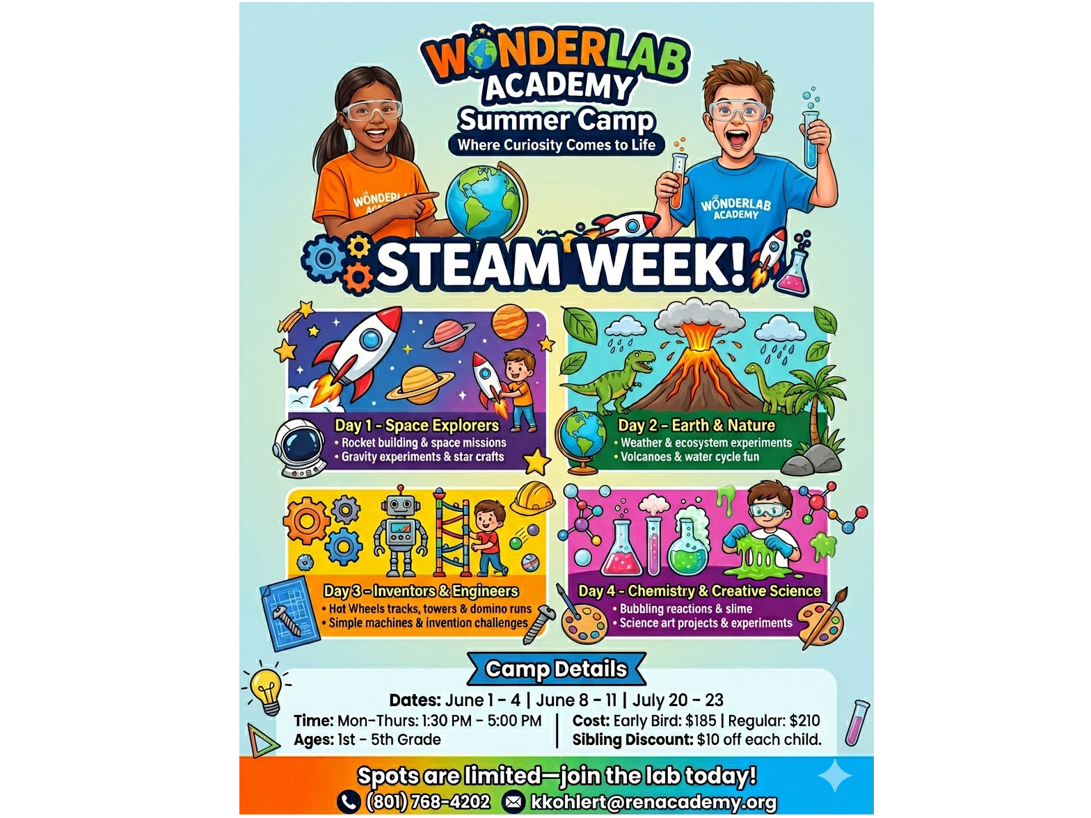 An exciting, hands-on summer program where students become scientists, engineers, artists, and innovators! Campers will explore Science, Technology, Engineering, Arts, and Math (STEAM) through engaging challenges, creative projects, and real-world problem-solving. From building structures and experimenting with reactions, to designing inventions and testing their ideas, each day is packed with interactive, curiosity-driven leaning experiences that build confidence, creativity, and critical thinking.
